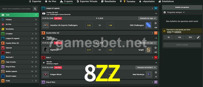 O 8ZZ oferece uma grande seleção de opções de apostas em e-sports com probabilidades competitivas